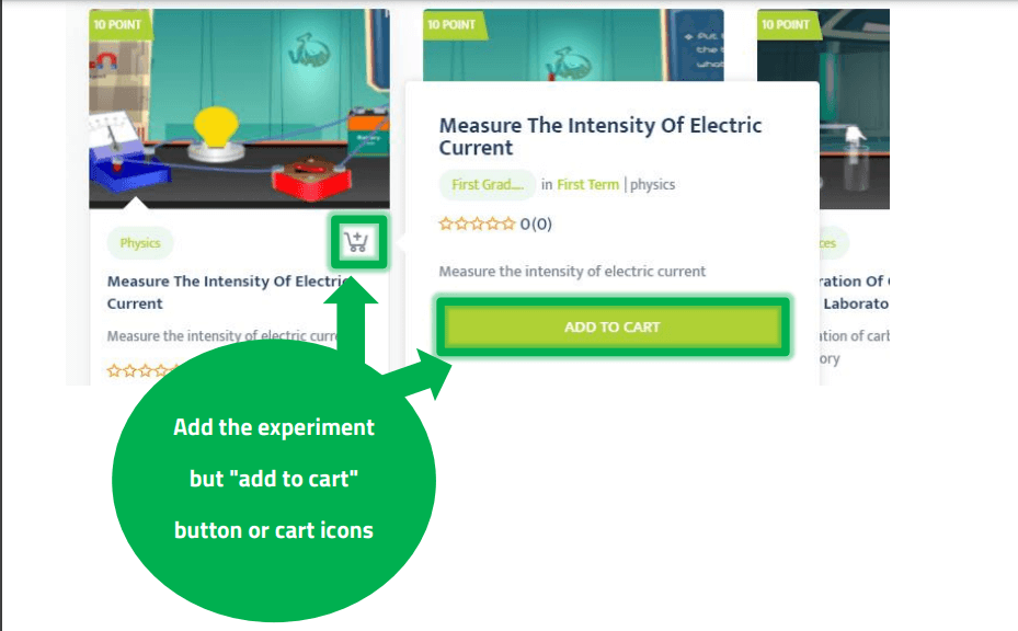 Choose the experiment you want to buy and press the "add to cart" button or the basket icon specified in the image