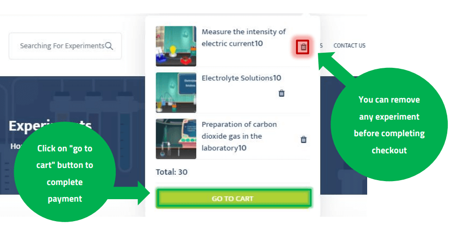 and "go to cart" button. You can remove any experiment before completing the purchase by clicking on the trash can