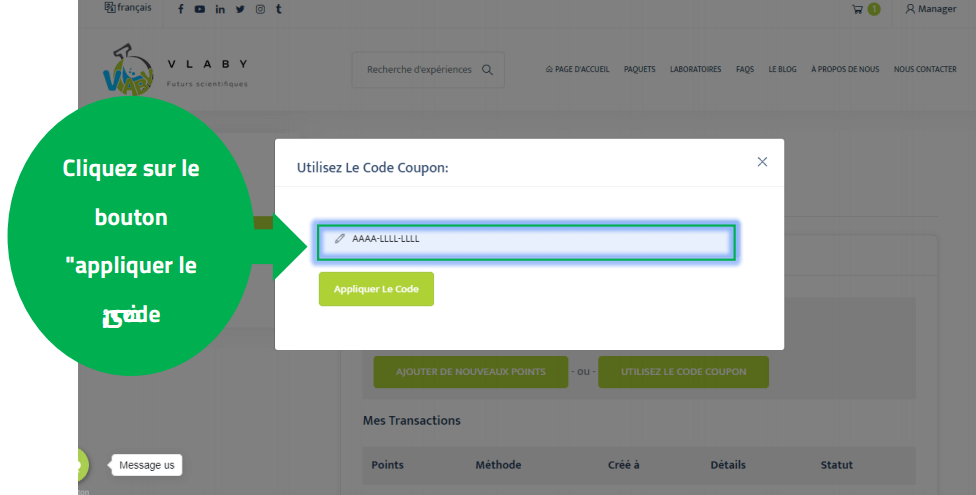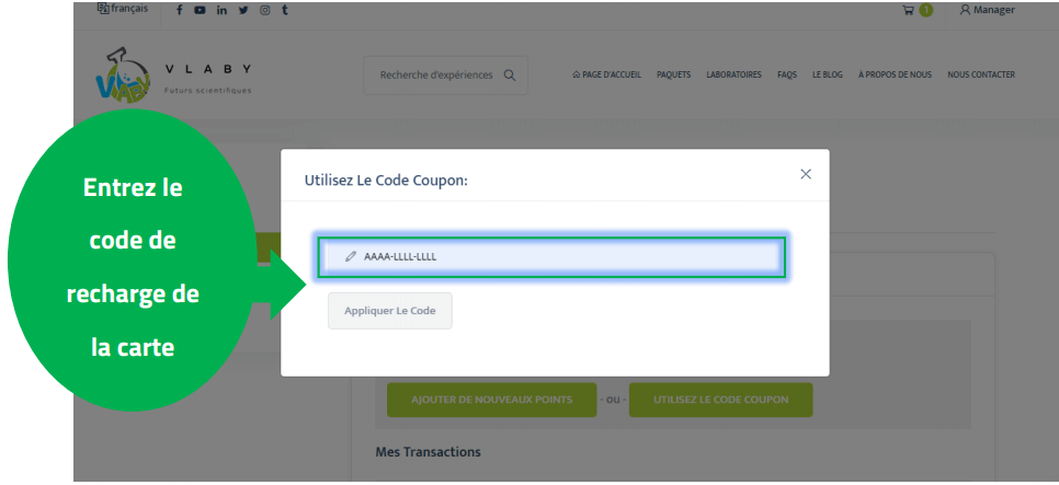 Saisissez le code inscrit sur la carte de recharge Vlaby