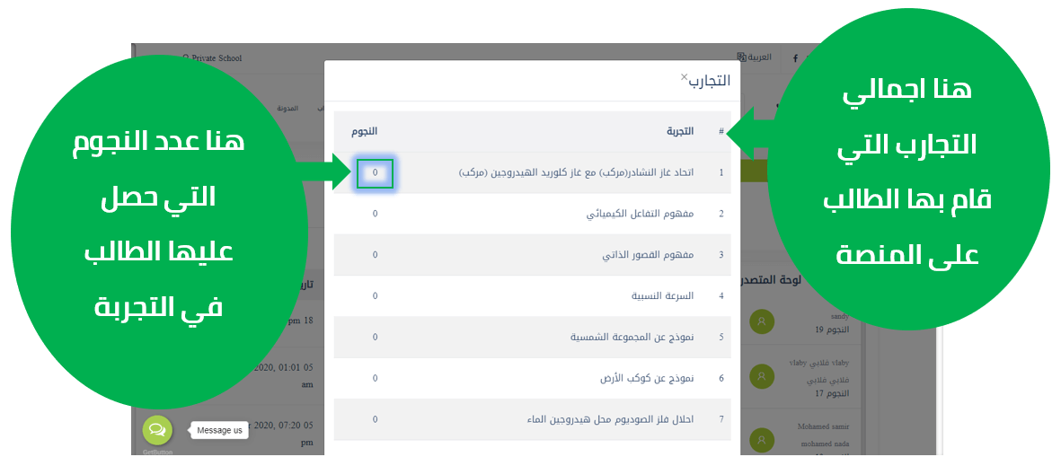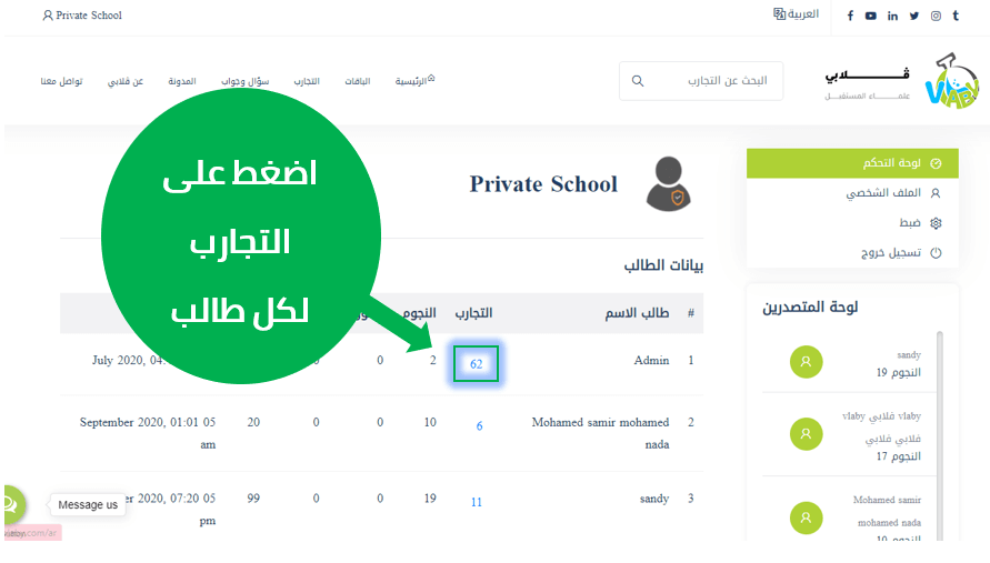6. يمكنك الضغط على كل طالب لمعرفة بيانات مفصلة عنه و عن التجارب التي قام بها